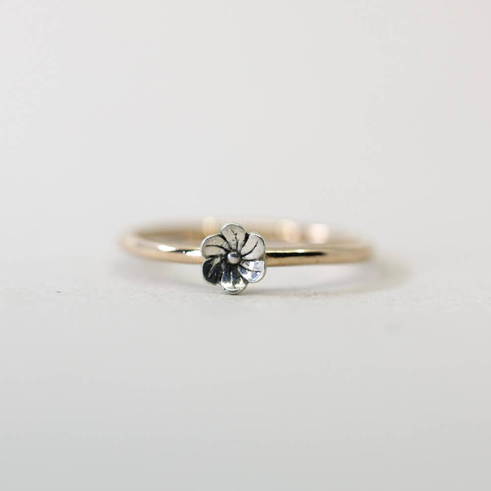Embrace your inner flower child with our dainty blossom ring. This ring features a tiny sterling silver flower blossom on a dainty but sturdy 14k Gold Filled band.