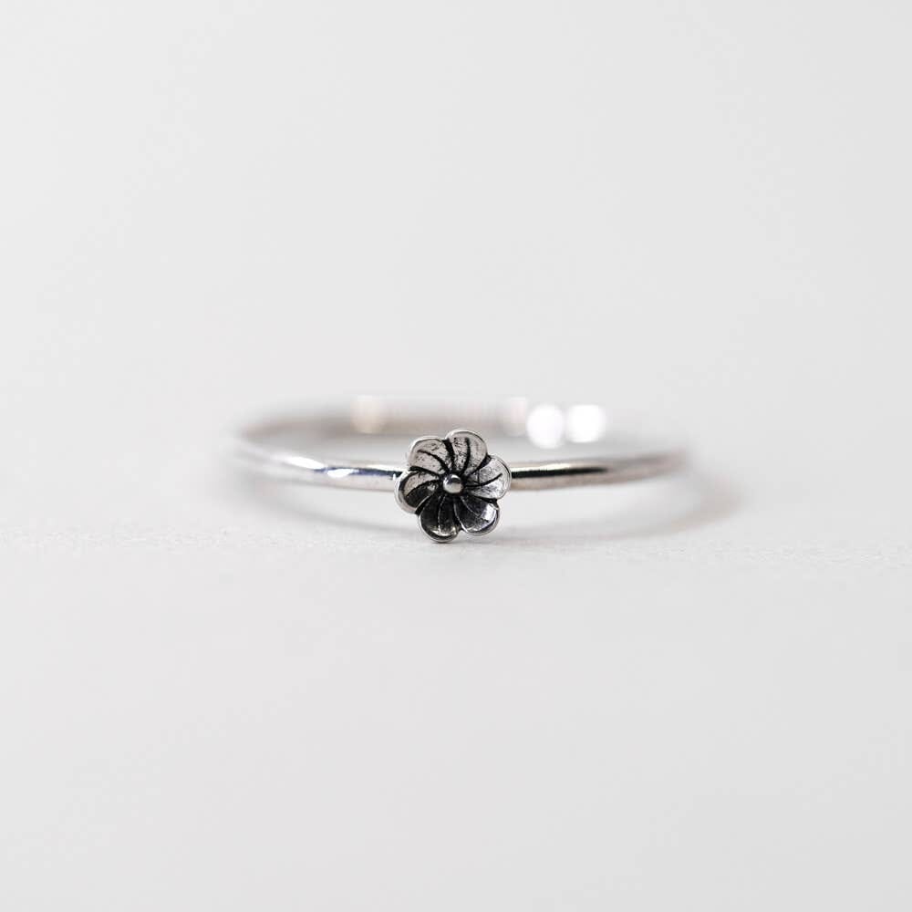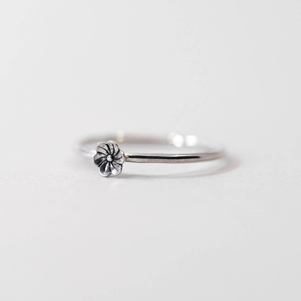 Embrace your inner flower child with our dainty blossom ring. This ring features a tiny sterling silver flower blossom on a dainty but sturdy silver band.