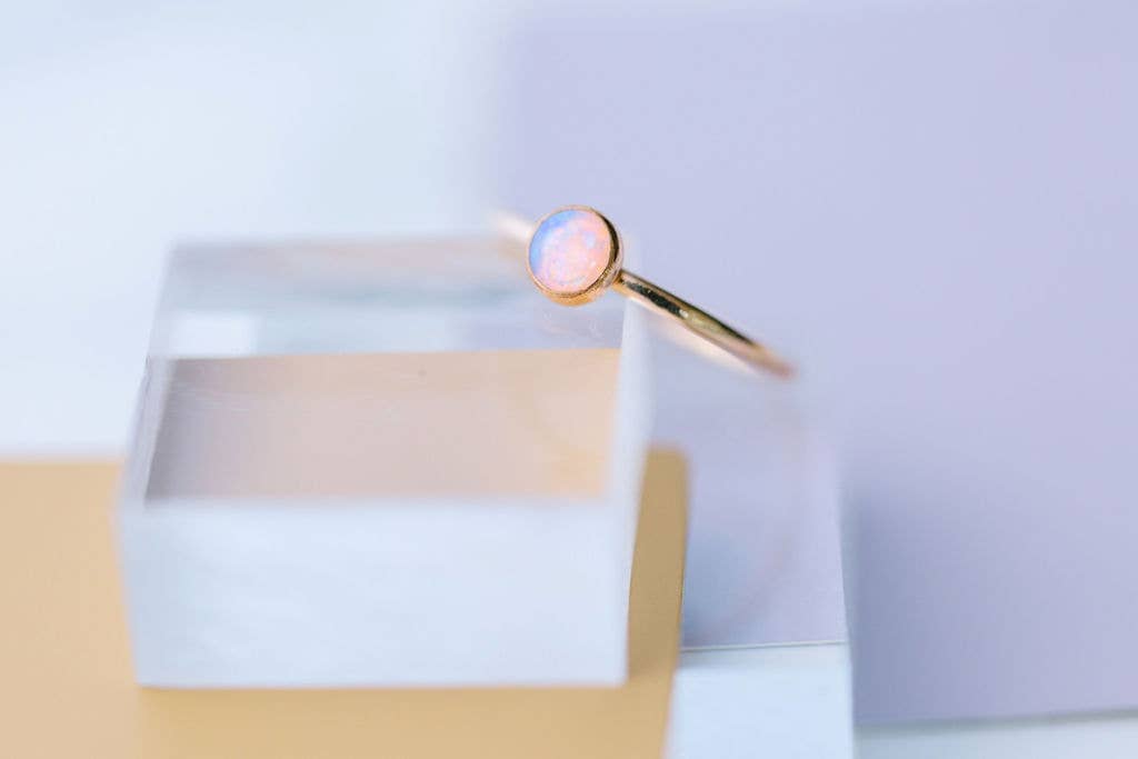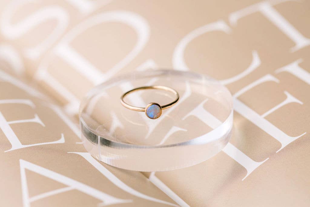 This ring features a flashy 5mm ethiopian opal set on a dainty gold band. Every opal is a little different and will have flashes of blue, purple, and pink depending on the lighting