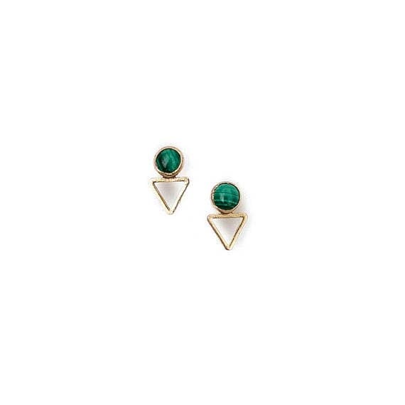 Brass bezel setting with Malachite cabochon stone and tiny open triangle. Sterling silver posts and backs. 5mm x 12mm. Studs have been polished to a shine and sealed.
