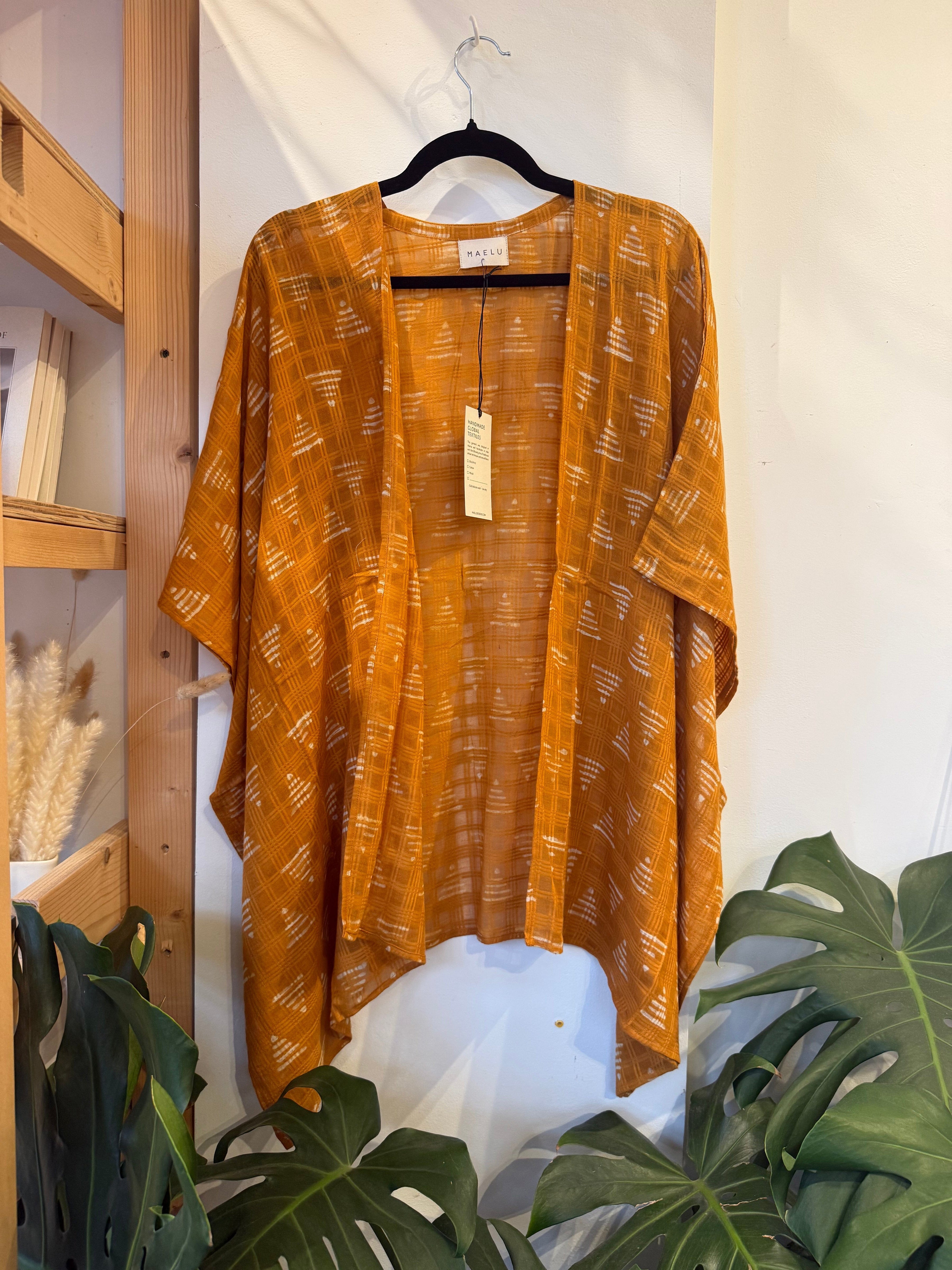 The various patterns in this garment have all been individually hand block printed throughout the fabric, making each one completely unique. Due to the handprinted nature of block print, slight color differences and imperfections between fabrics are expected. These differences enhance the beauty of our textiles and are celebrated. Some natural dyes, especially indigo, may bleed and transfer. We recommend washing gently or with like colors in cold water and air drying.