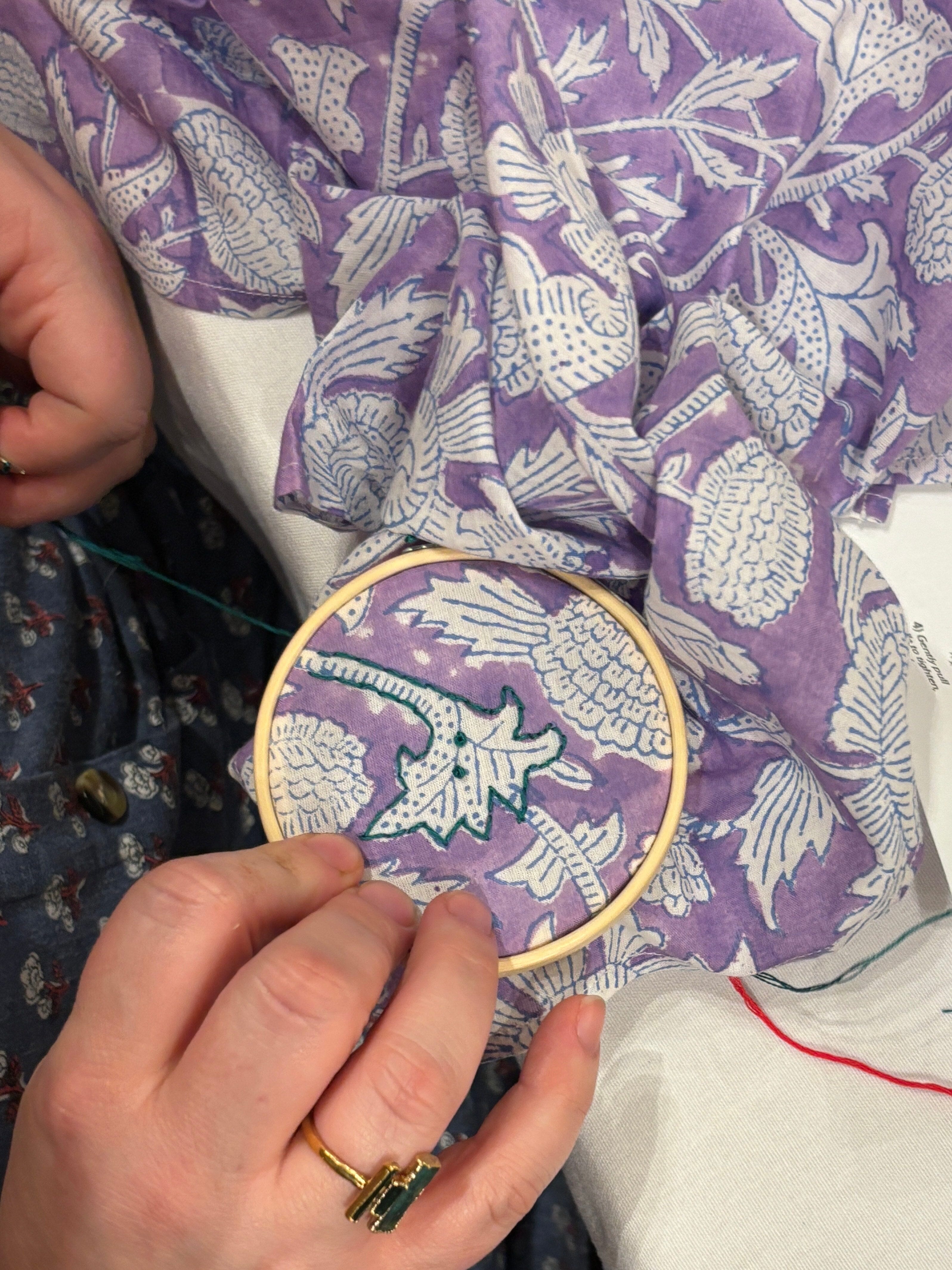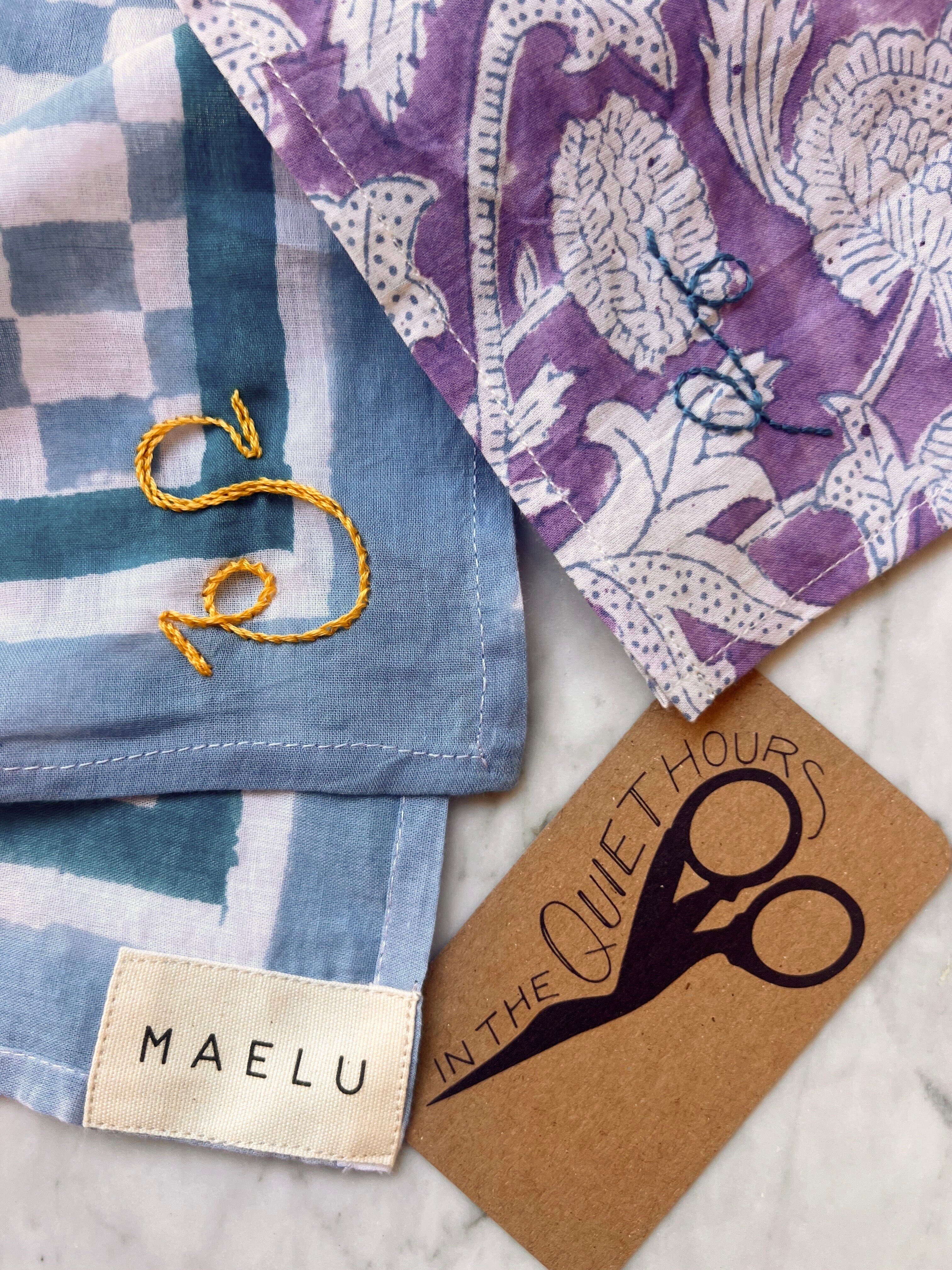 Add a personalized touch to a hand block printed Maelu bandana during this bespoke hand embroidery workshop with Sarah Roberts, of In The Quiet Hours. Sarah will lead you through beginner stitch techniques and offer a few design ideas to get you started on creating this one-of-a-kind gift to give or keep for yourself! Learn to embroider initials, simple designs such as a cat/dog or choose to elaborate on the blockprint patterns in the bandanas. This class is for any skill level and no previous experience is needed. All embroidery supplies along with one Maelu bandana of your choice are included!